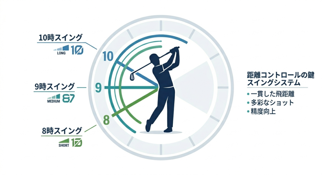 アプローチの距離感を安定させる唯一の答えは、「振り幅を一定にする」ことです。 インパクトの強さで調整しようとすると、緩んだり打ち急いだりして、手前を叩く「ダフリ」やボールの頭を打つ「トップ」を招きます。 自分の体を時計の軸に見立てた、以下の3つの基準をマスターしてください。