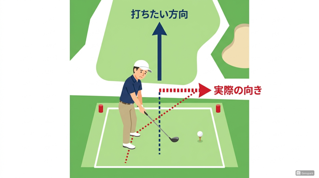 - 原因: 視覚的な錯覚により、足のラインを目標に向けてしまう(実際には目標と平行な「線路のレール」を意識すべき)。