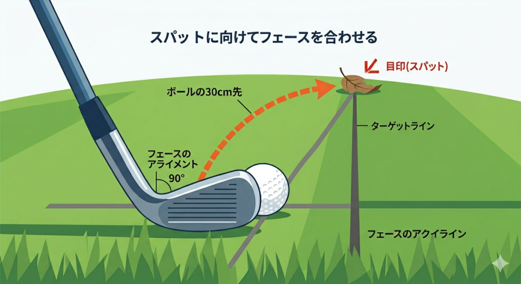 芝の色が変わっている場所や落ちている葉っぱをスパットにする。 - フェースをスパットに合わせる